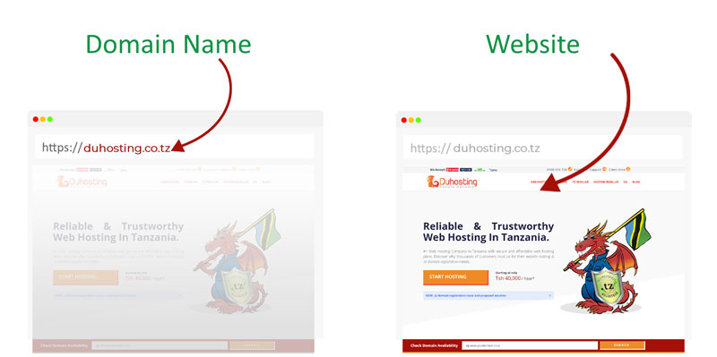 Moja ya vitu ambavyo watu wengi wamekuwa wakichanganya ni kuwa, website na Domain wakichukulia ni kitu kimoja. Hivi ni vitu viwili vinavyofanya kazi kwa kushirikiana. Website ni muunganiko wa kurasa za kwenye mtandao zinazotambulishwa kwa kutumia jina moja (Domain Name) zikiwa zimehifadhiwa na kuchapishwa (Published) angalau kwenye server moja inayopatikana katika mtandao wa Internet. Wakati Domain name ni jina linaloitambulisha website kwenye ulimwengu wa mtandao (Internet), mfano dulaw.co.tz ni domain name lakini ndani yake kuna system kwa ajili ya kurahisisha kazi za wanasheria. Hivyo unaweza kuwa na website bila jina na pia unaweza kuwa na jina bila Website lakini hakuna kimoja kinachoweza kufanya kazi bila ya mwingine (Vinashirikiana). Pia, tunapozungumzia Website tunamaanisha ni sehemu mojawapo ya aina ya taarifa zilizohifadhiwa kwenye mtandao lakini inaweza kuwa ni Software mfano Dulaw.co.tz , Application mfano TanzMED, Email, Kifaa cha kwenye mtandao (IOT) nk. Zote hizi zinatumia domain kuweza kufikia mafaili au kifaa husika. Kwa lugha rahisi, Domain ni utambulisho/ jina wa kifaa au website kwenye mtandao, badala ya kuita Kibabla kwenye mtandao utaita duhosting.co.tz. Hivyo unaweza kununua jina la Website sehemu nyingine na ukafanya Web Hosting sehemu nyingine kabisa.