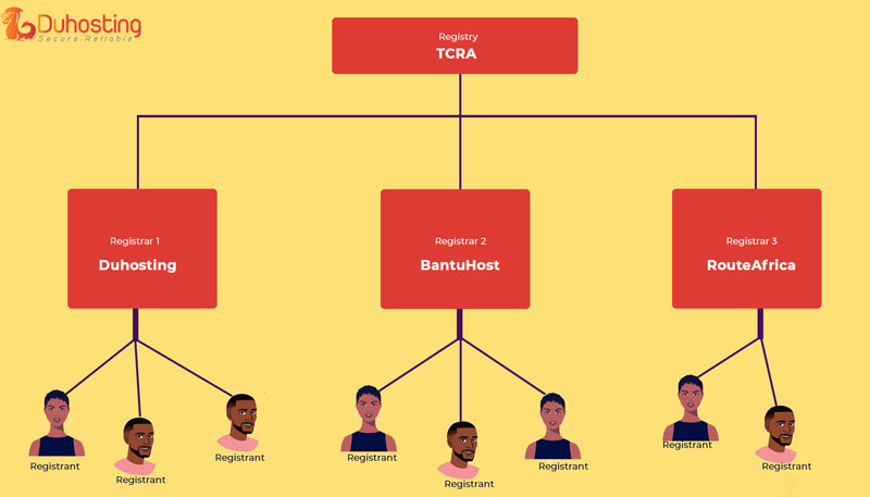Katika usajili wa domain kuna muundo rasmi katika ufanikishaji wa usajili, kila muhusika anakuwa na jukumu lake na ukomo wa majukumu kama ifuatavyo.